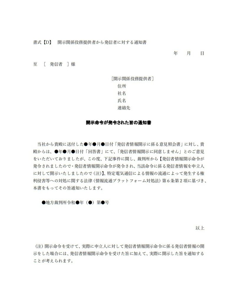 これは、前述したとおり、プロバイダーが申立人に対して発信者の氏名、住所等の個人情報の開示を行ったことをお知らせするものです。